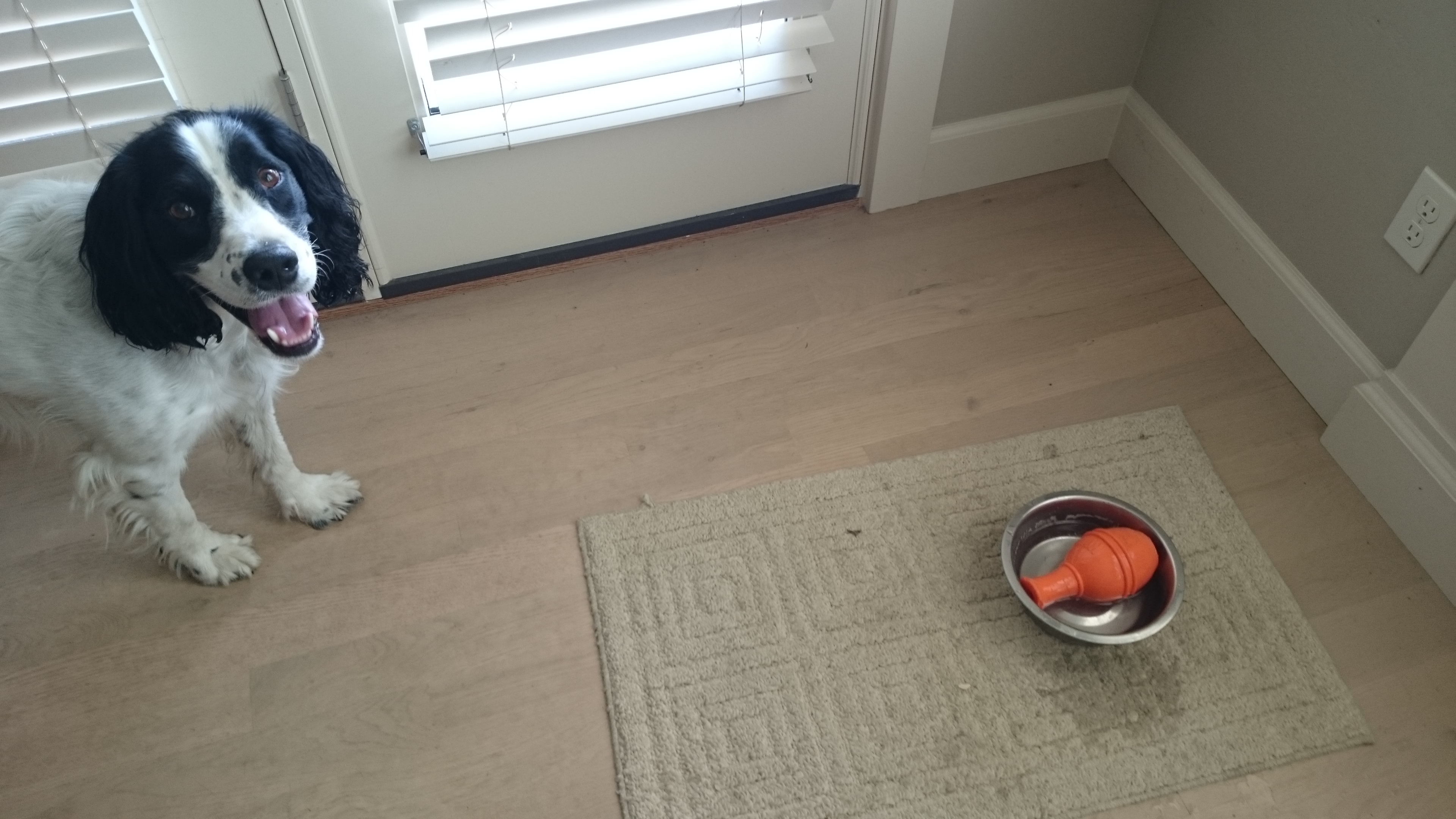 This morning A.J. was bouncing around the house with a toy in his mouth. He decided he was thirsty, so he trotted over to his water bowl, his toy still in his mouth. When he got to his bowl, he gently placed the toy in the bowl, then proceeded to drink around it.