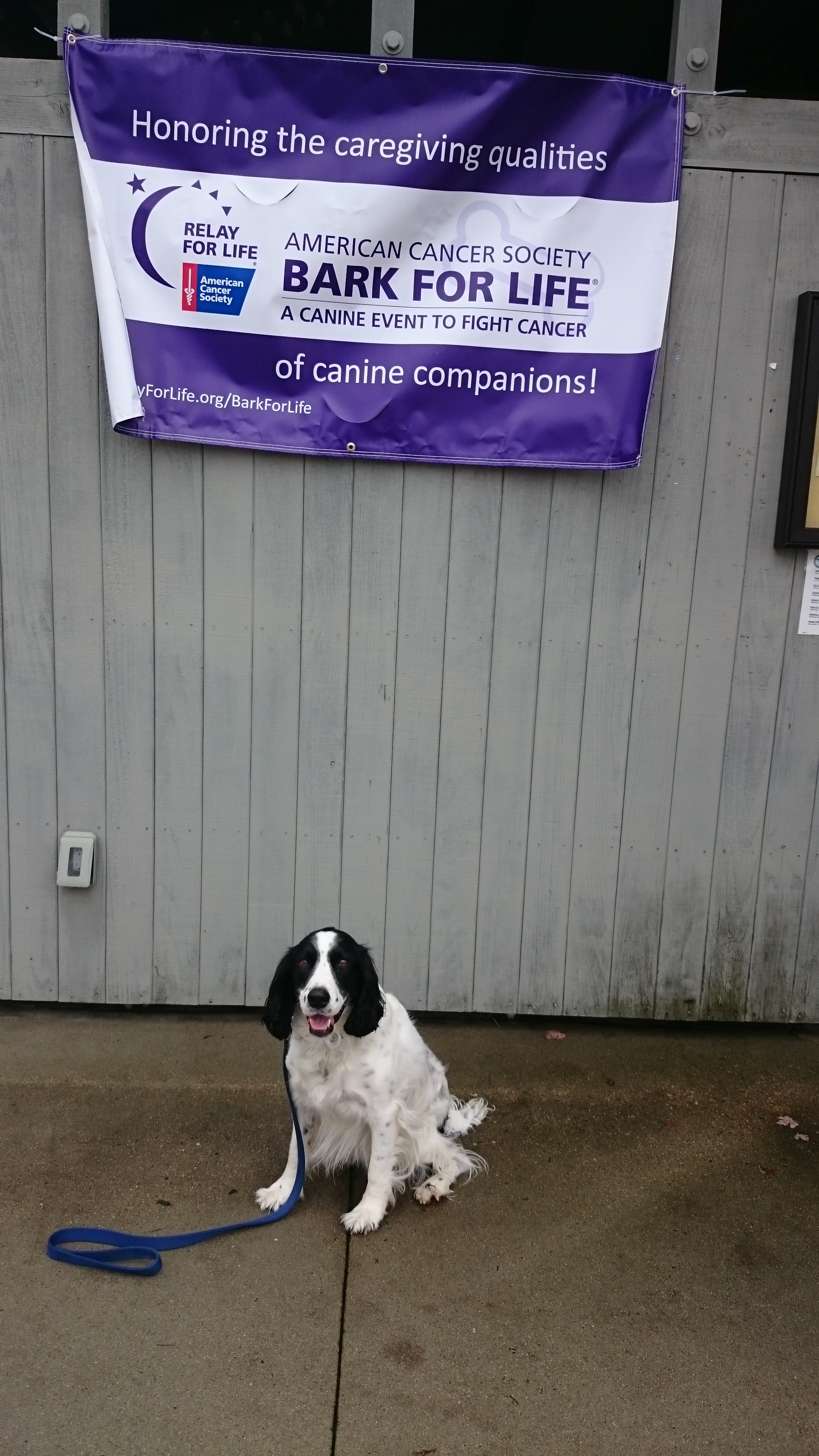 A little over a year ago, Greg and I participated in Relay for Life, a fundraiser for the American Cancer Society. A.J. wasn’t able to join us for that event because no dogs were allowed. This weekend A.J. finally got his opportunity to help. We all participated in Bark for Life, a dog walk for the American Cancer Society. A.J. did great around the other dogs, and topped the day off in true A.J. fashion by jumping into a mud puddle right before it was time to go home. But most important, he raised money for a cause very important to all of us.